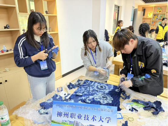 由财经与物流管理学院越南籍阮氏玄、泰国籍学生PLUBPLUENG APINYA(中文名:张鹿恩)及电子工程学院印度尼西亚籍学生RYO CARNAVARO(中文名:谢正豪)组成的代表队,以精湛的扎染技艺与鲜明的创意表达,赢得评委老师“你们显然是有备而来”的一致认可。在团体赛备赛过程中,国际教育学院与艺术学院紧密协作,为国际学生团队提供了“沉浸式”的文化体验与创新指导。