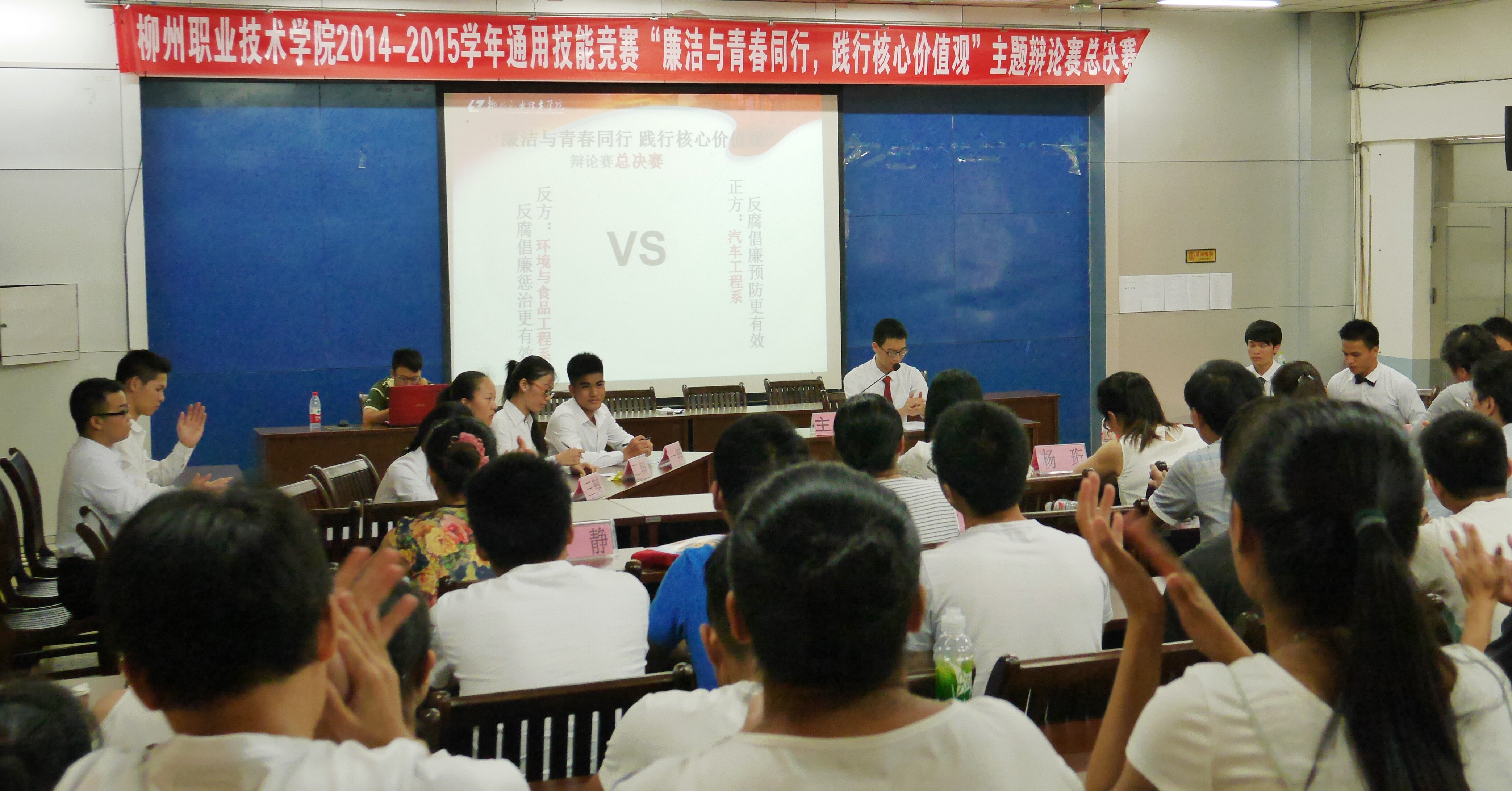 至此,由素质教育基地主办、思政教学团队和高职语文教学团队承办、万维口才协会协办的柳州职业技术学院2014-2015年大学生通用技能竞赛“廉洁与青春同行,践行核心价值观”主题辩论赛圆满落幕。财经与物流管理系代表队的姚亚汝、万维口才协会的李贵琼、环境与食品工程系的周婷、张兰,汽车工程系的谢强会、龙飞荣获“单场最佳辩手”称号,其中周婷同学表现更胜一筹,同时还获得了“大赛最佳辩手”称号;机电工程系雷德添、电子信息工程系李丹丹、艺术设计系孙嘉华、贸易与旅游管理系梁明添、万维口才协会李贵琼、财经与物流管理系姚亚汝、汽车工程系的许银杰荣获“单场最佳风格” 奖,其中许银杰表现突出,同时获得“大赛最佳风格”奖。