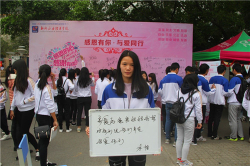 活动主要以两种形式开展,一是鼓励学生现场给父母、师长、朋友等发送感恩祝福短信,二是鼓励学生在签名墙上签名、写祝福语,并与祝福语合影,且将照片发布到朋友圈或QQ空间。活动得到了全院1500余名师生参与,同学们纷纷掏出手机送出他们的祝福,或在白板上写下自己的心声。“亲爱的爸爸妈妈,我想对你们说:你们辛苦了,我爱你们!”“老师辛苦了!”这些祝福语言简朴却满含情意。