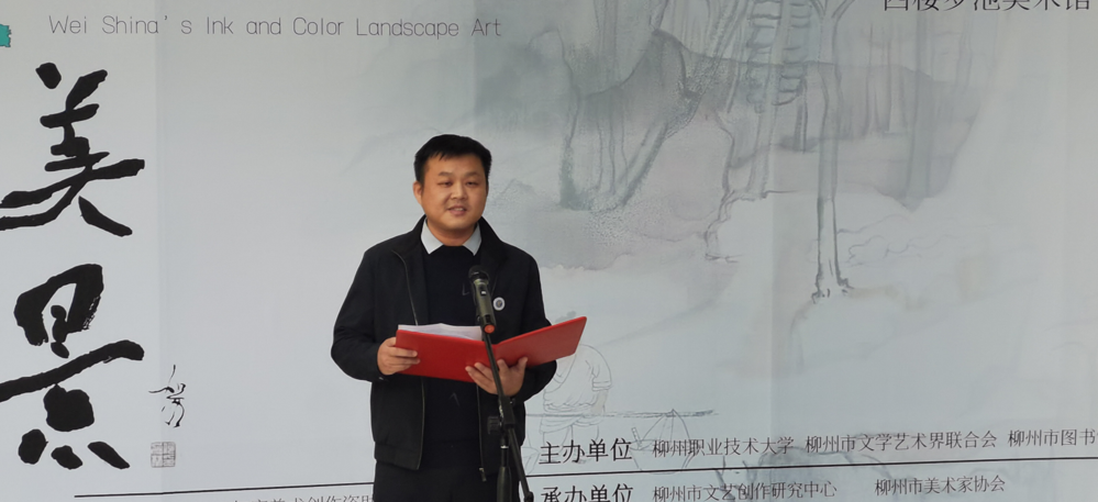 此次展览开幕式由柳州市文联党组成员、副主席蒋玉主持。我校艺术学院党委书记贾洪峰在开幕致辞中指出,艺术学院近年来在教育教学改革、人才培养等各方面都取得了很多突出成绩,学院一直以来大力支持教师们将高水平艺术创作与教学科研紧密结合,为培养高素质技术技能人才筑牢坚实根基。而韦诗呐老师正是艺术学院教师团队中的优秀代表,她的艺术创作与育人实践堪称学院推进“十大育人体系”的典范,生动诠释了实践育人与课程育人的突出成效。
