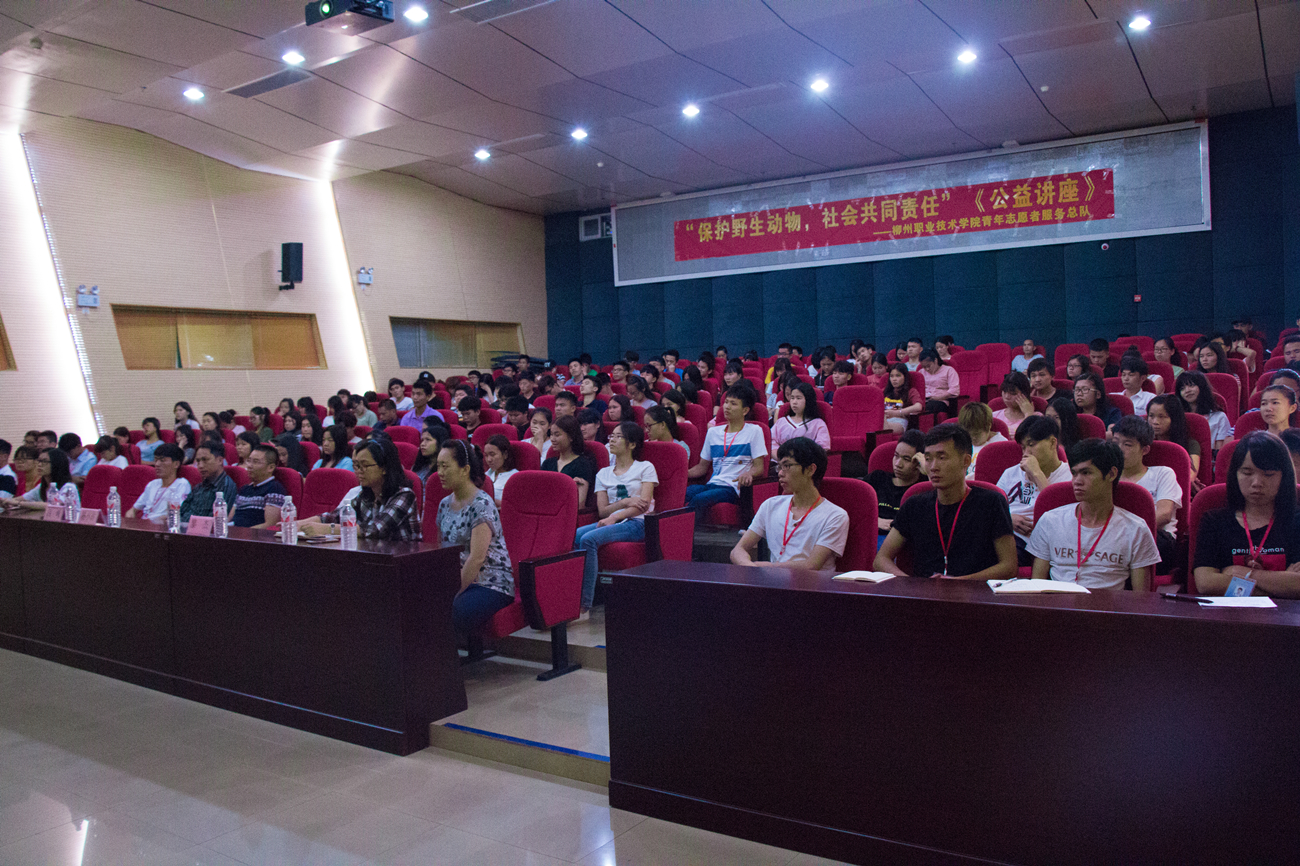 蒋副局长则从理论上、情感上、法律上三个方面深入论述保护野生动物的重要性和必要性,为我校师生讲解了野生动物的相关知识、保护野生动物的方法和意义。通过图片、视频等方式,展示动物的现状、柳州市受国家保护的七种动物、国家濒危的物种、国家对破坏野生动物的惩罚力度。还以非法杀害野生动物而获刑罚款的例子,让大家了解放生的要求及各种世界保护野生动物组织。最后发出倡议,希望大学生们能够尽一己之力爱护野生动物。