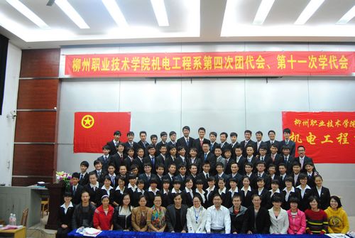 2013年11月22日下午14时30分,机电工程系第四次团员代表大会、第十一次学生代表大会在博闻楼110教室隆重召开。本次大会的主要任务是:总结第三次团代会、第十次学代会以来全系团学工作,明确今后全系团学工作的指导思想和奋斗目标,选举产生共青团柳州职业技术学院机电工程系第四届委员会委员和柳州职业技术学院机电工程系第十一届学生委员会委员。院团委书记王慧、机电工程系党总支书记安掌明、机电工程系主任韦林、系团委书记莫丽娜和各学生党支部书记出席了本次大会。各兄弟系部团委书记、系辅导员老师们和各系学生会代表也应邀出席。出席本次大会的正式代表共174名,大会在庄严的国歌声中拉开序幕。