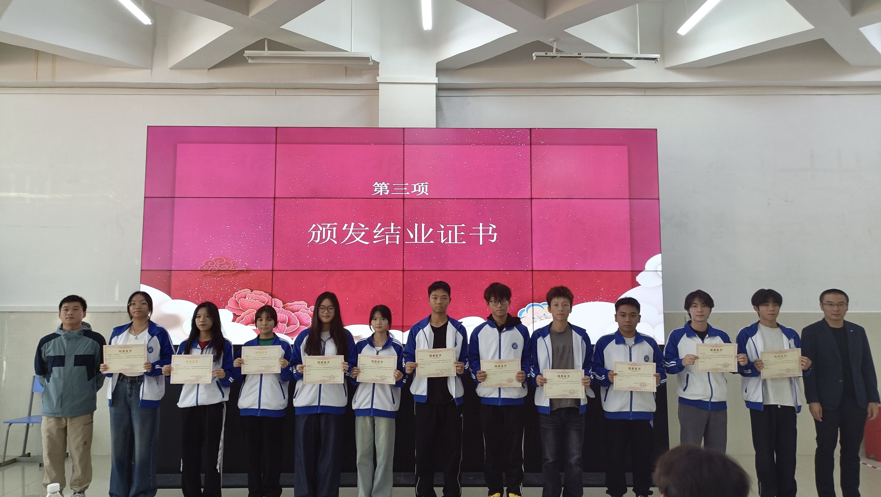 结业典礼开始。首先,主持人对2024年度青马班的整体情况进行了回顾。在过去的一年里,青马班学员们深入学习了马克思主义经典著作,参与了红色文化调研、社区志愿服务等实践活动,不仅在思想上得到了升华,更在实践能力和社会责任感方面有了显著提升。赵宇同学代表2024年青马班学员讲话,他向所有学员发出了号召,号召大家带着在青马班收获的知识与力量,走向更广阔的天地,继续传承和践行马克思主义。随后,杨小浒、黄磊为2023年优秀结业学员代表颁发结业证书。