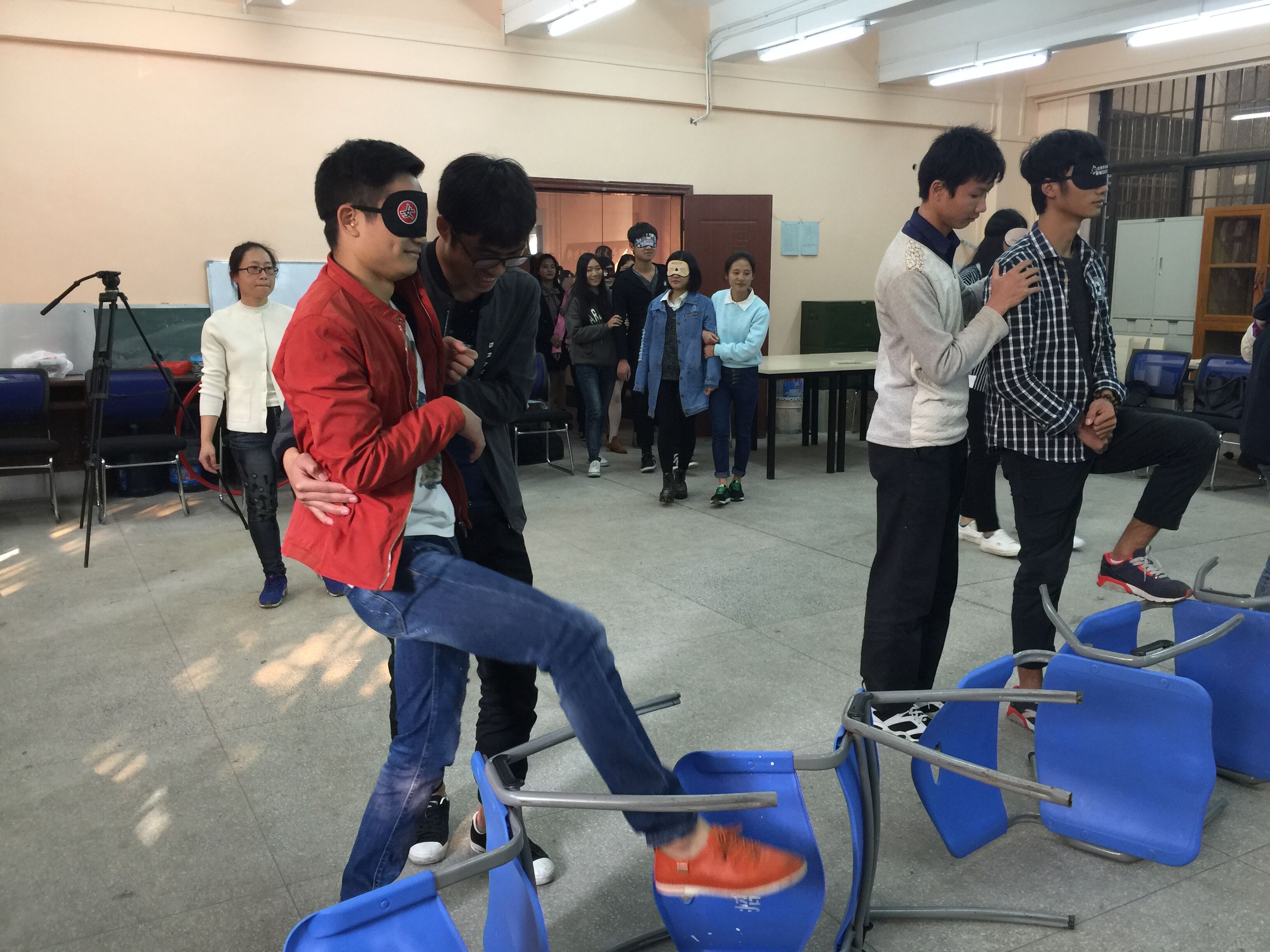 左教授以《在一起,飞更高》的视频为序曲拉开了培训活动的序幕。该视频主要表现合作在团体中的力量,随后通过信任之旅、信任背摔、驿站传书三个互动环节,让学生干部体验信任的力量、勇于担当的责任感和严格的规矩意识。“信任背摔”环节将整个培训会推向了高潮,学生干部从一开始的“不相信,不敢倒”到“放开胆,试着倒”直至最后的“勇敢垂直倒下”,伴随着一声声坚定的呐喊,他们这一次次“背摔”不是轻易的摔倒,而是倾注了对同伴所有的信任。不少学生干部在培训会上分享道:“活动让我们很受触动,也让我们深刻体会到,只有依靠队友,才能走到最后”。